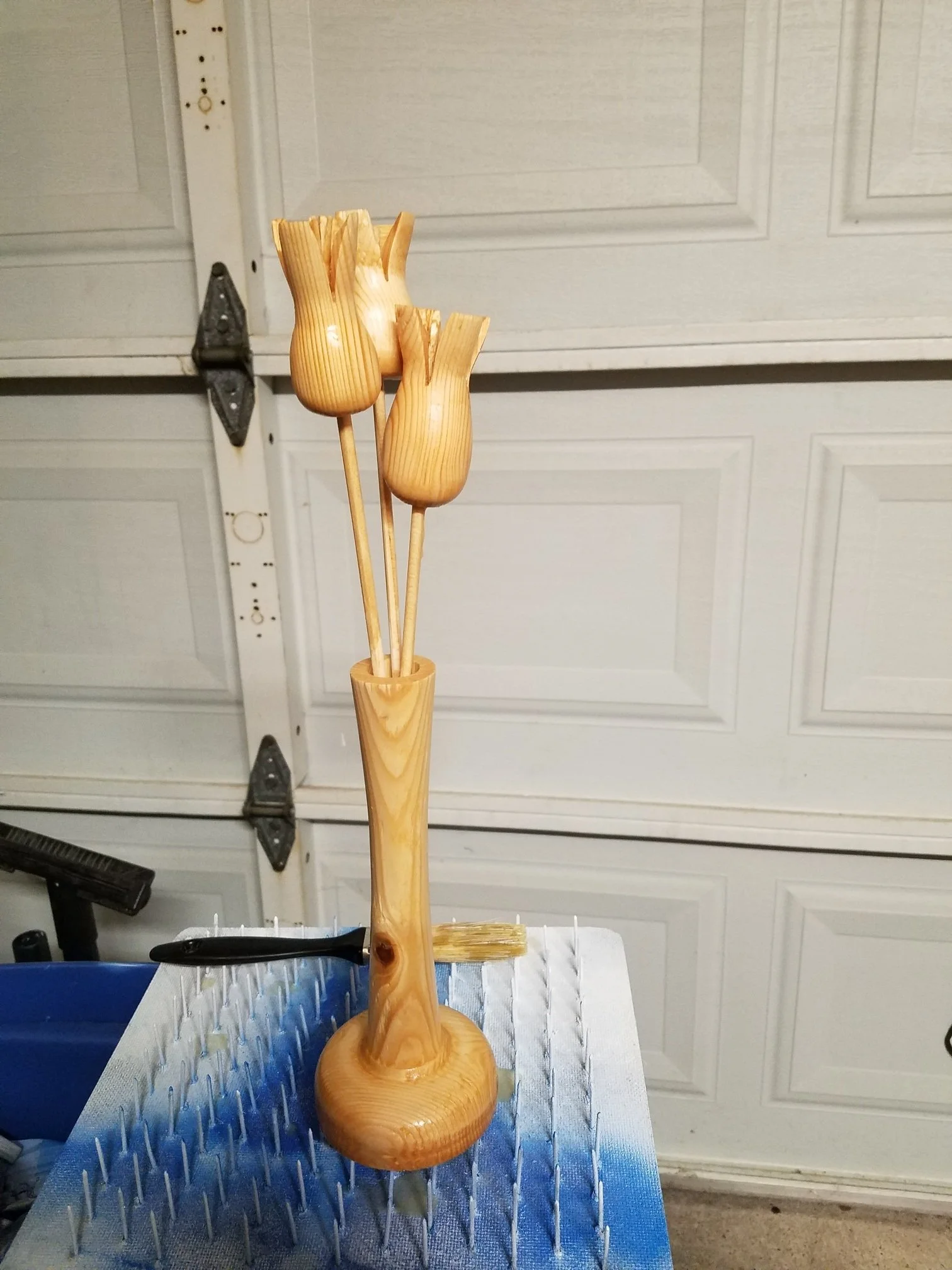 Feb of 2019, JuJu and I agreed that we wouldn’t spend any money for Valentine’s Day. The next day I saw a video about turning flowers on a wood lathe, so I went to the scrap pile to get some lumber to try it myself. 45 minutes later I had three flowers ready for stems. The next day I went back to the scrap pile and made the vase for the flowers to go in. Of course I had to go to “the big box store” and get a dowel. She was mad when she saw I had a receipt, she was even more angry with me when she saw I’d only spent $0.97, but she literally melted when she saw the flowers. Click here to see the YouTube short I made of the process.